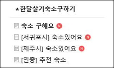 카페로 접속하시면 다음와 같은 화면이 나타납니다. 여기에서 왼쪽 카테고리를 살펴보시면 '한달살기숙소구하기'가 보이실 것입니다.