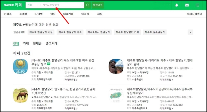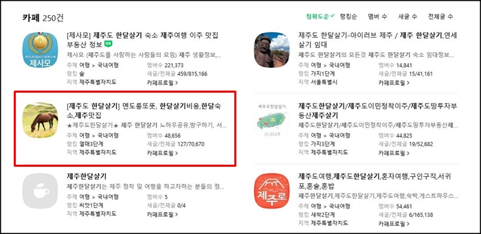 그럼 아래와 같이 다양한 관련 카페들이 나타나게 됩니다. 개인적으로 제가 지난 가을에 10일동안 제주도 생활을 하기 위해 많이 참고했던 카페는 [제주도 한달살기] 멘도롱또똣 카페입니다.